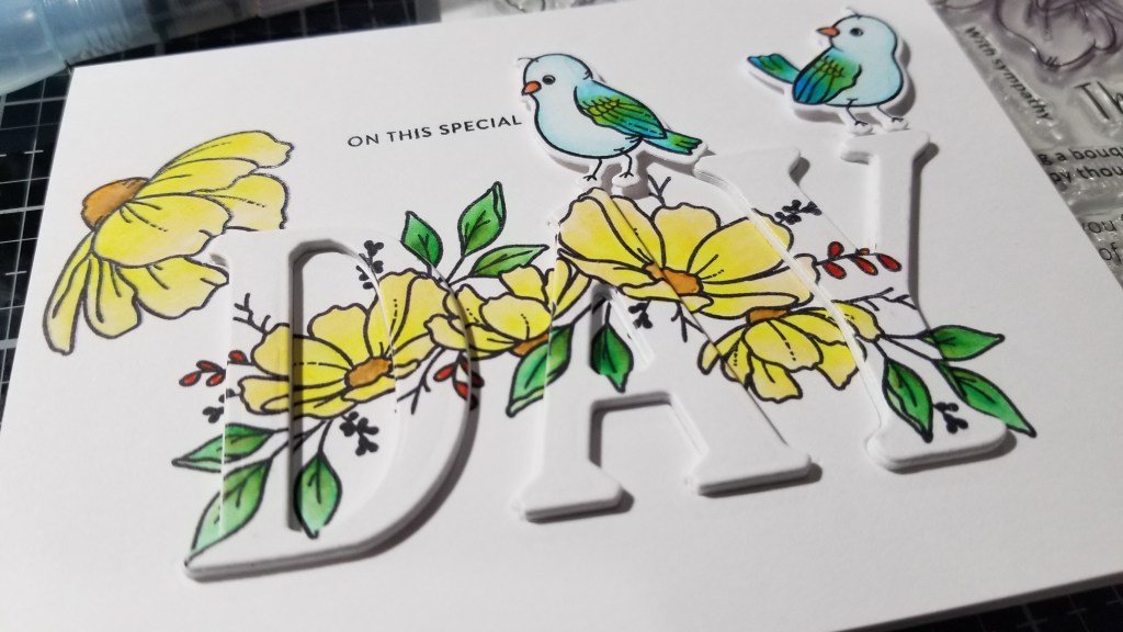 The real attraction is the large letters spelling the word DAY. I love this design, as it allows me to stamp, colour and die cut with one card for any occasion. There are so many possibilities and variations.