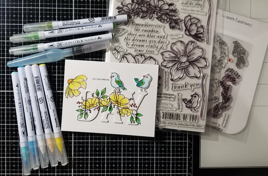 Other supplies used in making this card are Zig Clean Color Real Brush Pens which I LOVE. As I always say, I’m no artist but these pens allow me to colour anything and make it look pretty good. I will note, Bristol 300 Smooth is the best paper to use with these pens. I’ve used these on cardstock and Ranger’s Distress Watercolor Cardstock with decent results, but the Bristol gives me the best results, as it allows the water pen to move the colour around the page.