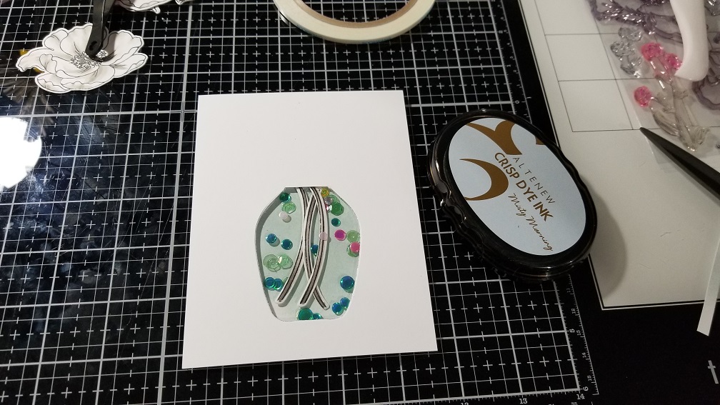 I attached my acetate, cut out another vase on craft foam for the back of the panel, and attached my stems between the foam and the panel. I added my sequins and pulled out my Altenew Morning Misty for the background of the vase.