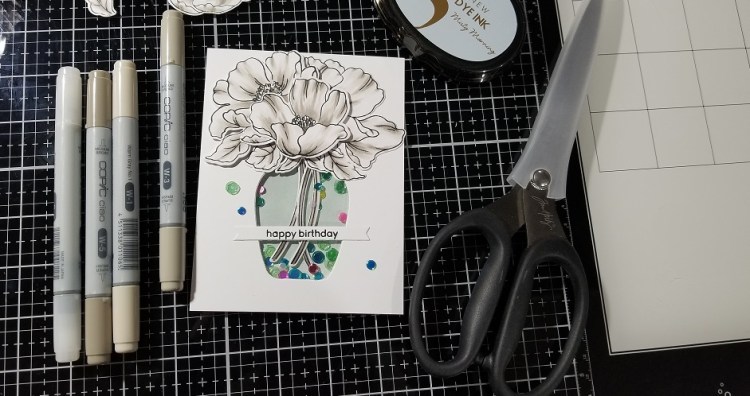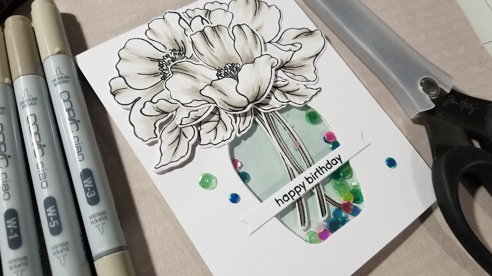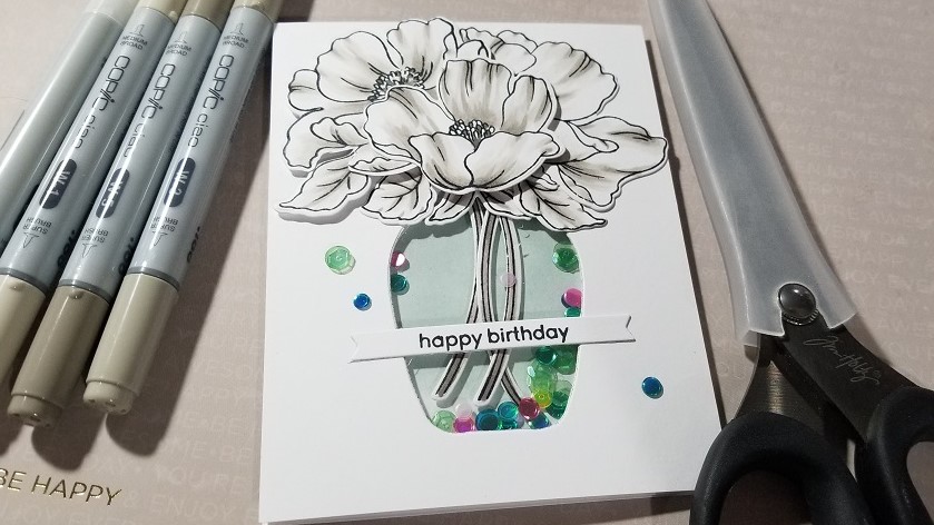 I used the happy birthday sentiment from Heffy Doodle Classic Sentiments on a banner strip and positioned in across the vase. And finally, I added some sequins for a little something extra.