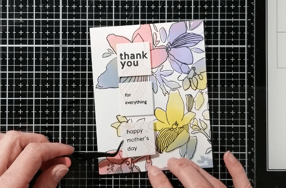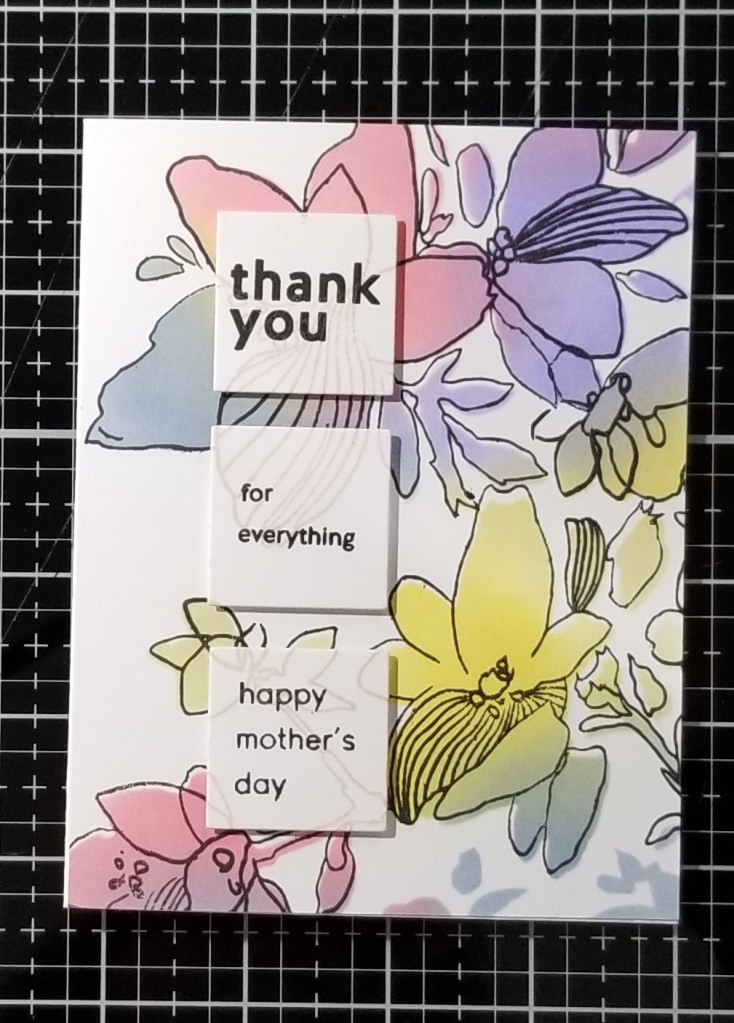 I add my sentiment squares to my main panel, lining the stamp on the stamp on the squares to the stamp on my ink-blended panel. I used 2 sentiments from Simon Says Stamp Window Frames stamp set and the “mother’s day” sentiment from Heffy Doodle – Classic Sentiments.