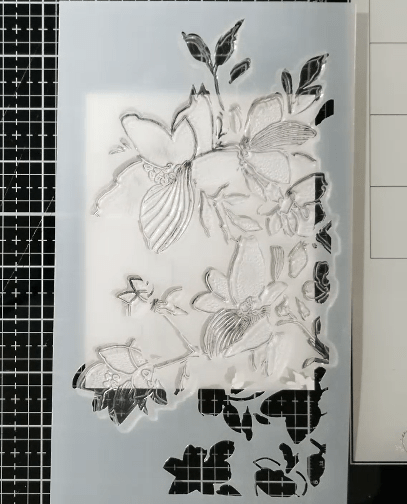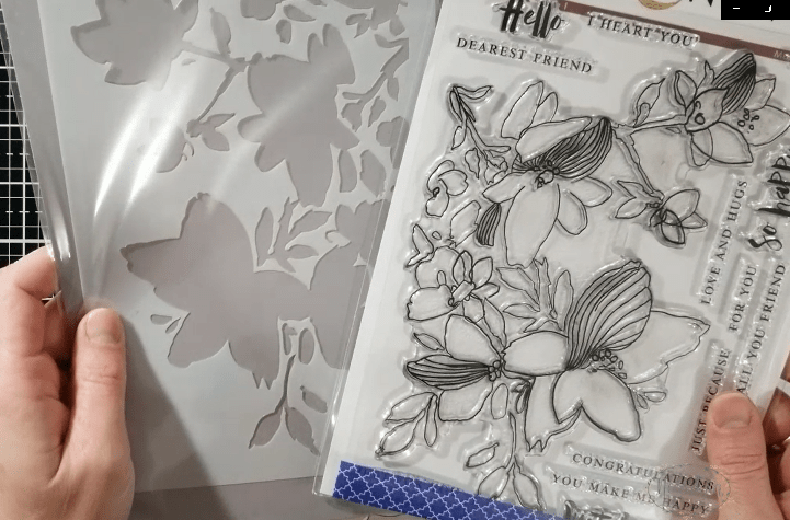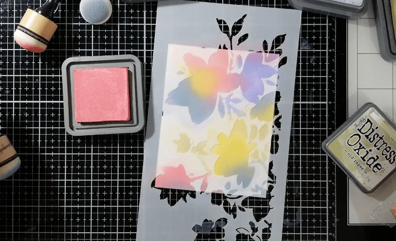 First, I lined up my floral stamp where I wanted it on my panel. Then I put my stencil on top and lined it up to the stamp and marked where the stencil lines up on the card. This is so I can remove and reposition the stencil after I take away the stamp. I placed the stencil back onto the panel where I had made my marks, and took my oxide inks and blended them anywhere and everywhere within my stencil.
