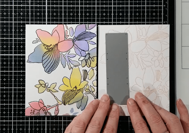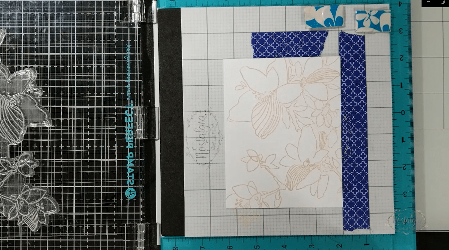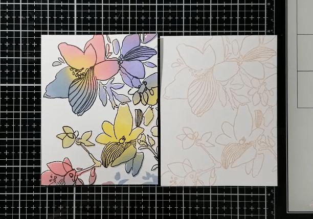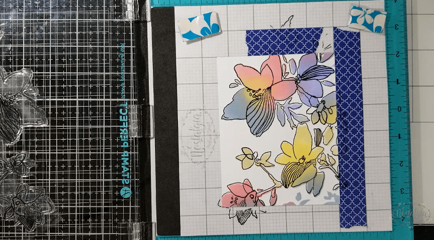 I take the stamp, line it up over my blended area, and stamp the Sketchy Floral in Versafine Onyx Black. I love this ink, as I get a nice crisp impression. Then I leave my stamp on my positioner and stamp another panel in tattered rose. Tattered Rose, distress oxide ink is one of my faves. It’s so soft and beautiful – I was looking at buying a re-inker a week after I got his ink pad.