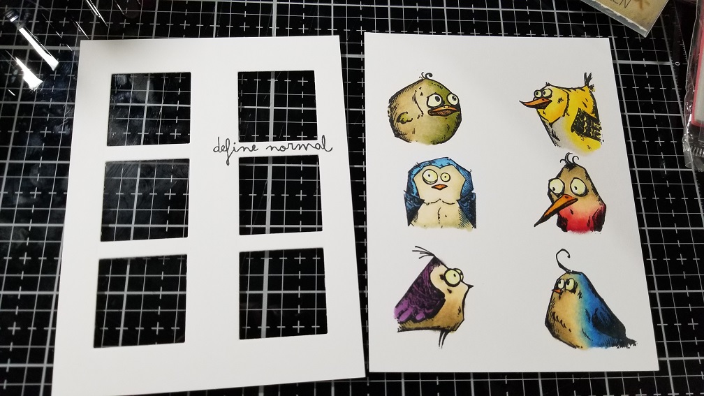 I did some rough measurements with my window die and my birds. Stamped all 6 different birds and chose similar copics as what’s on the cover of the Sizzix die packaging. I took the awesome “define normal” sentiment and nestled it between two of the windows. It fit perfectly.