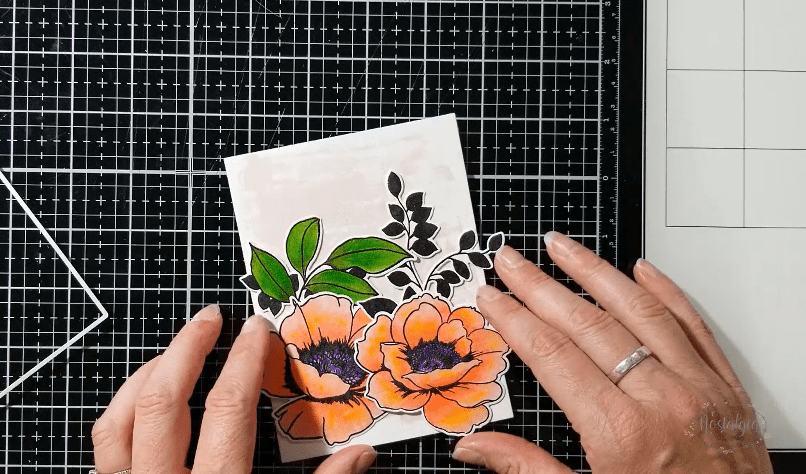 I stamped 2 flowers and 2 of leaves from the Altenew Wallpaper Art stamp set, colored them with my Zig markers and die cut them.