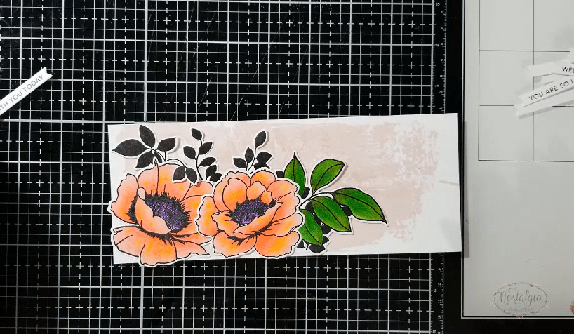 I placed the flowers and leaves on my A2 panel and realized they took up a lot of room, and I wasn’t interested in sacrificing any of my flowers or leaves, so that’s when I decided to create a slimline card.