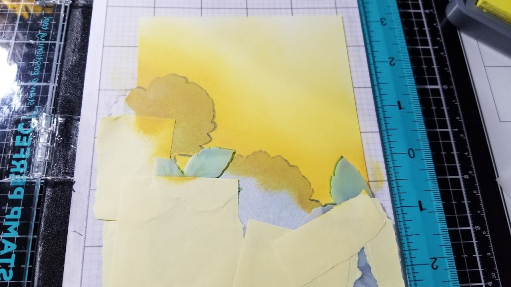 I used Altenew’s Antique Roses Stamps and Mask Stencils. This would allow me to use the Layers and I would blend out some distress oxide inks from the bundle of flowers. There are 5 stamp layers to each flower and 3 layers for each leaf. I used 4 Altenew inks – part of the Tranquility colour family, with the small center layer being stamped in black.