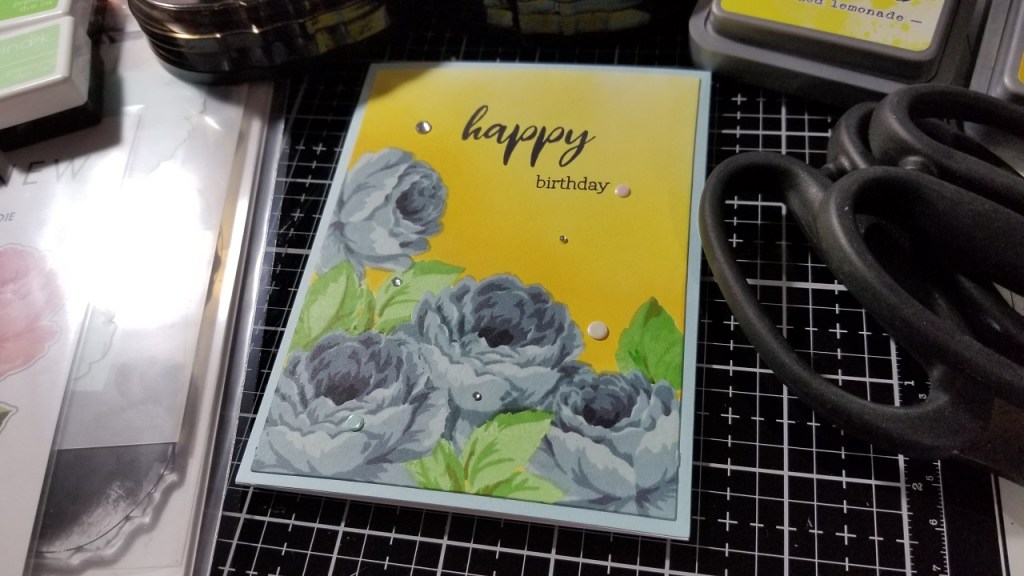 Now this wasn’t a hard card, but it was a bit time consuming with all the masking and layering. I love how the flowers tuned out in a bundle at one end of the card panel. I need to do more of these. 😊