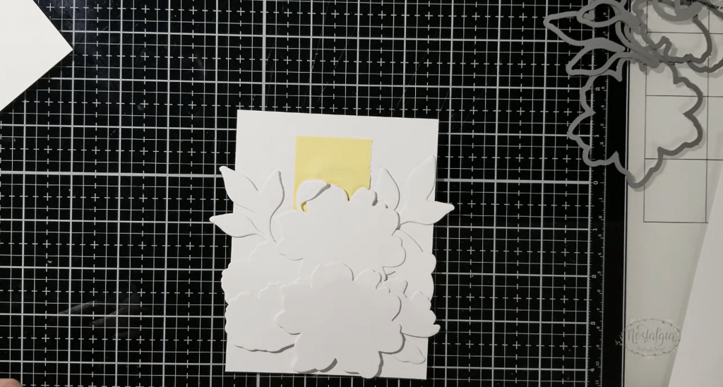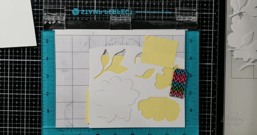 First, I die cut all the flowers and leaves I’m going to use and stamp them with the cut-out in my stamp positioner. (This will make the process faster, compared to stamping then die cutting each flower and leaf.) I laid out my cut flowers and leaves to give me an idea of their placement over the vase. Once I had an idea of my flower placement, I die cut half my vase. I didn’t die cut the entire vase, as the top of the vase would interfere with my slider mechanism. I die cut the lower half and used a blade to finish cutting out the paper.