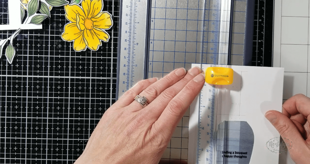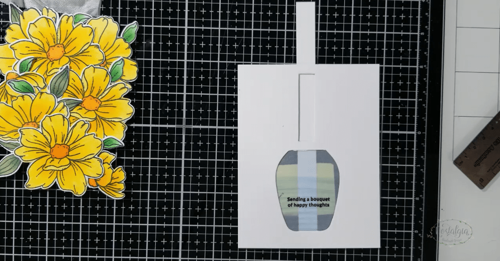 I wanted to do something other than a shaker card, but I don’t have any of those interactive die sets. With that said, there is a card I’ve been wanting to try, but haven’t gotten around to it yet, and this is the perfect opportunity to do so. I wanted to create a slider card with flowers being moved up to reveal a (shaker) vase. There’s nothing to shake with this one but it does reveal a sentiment.