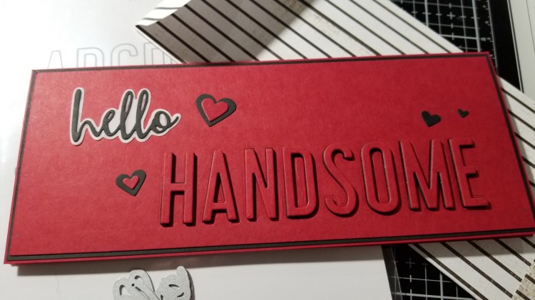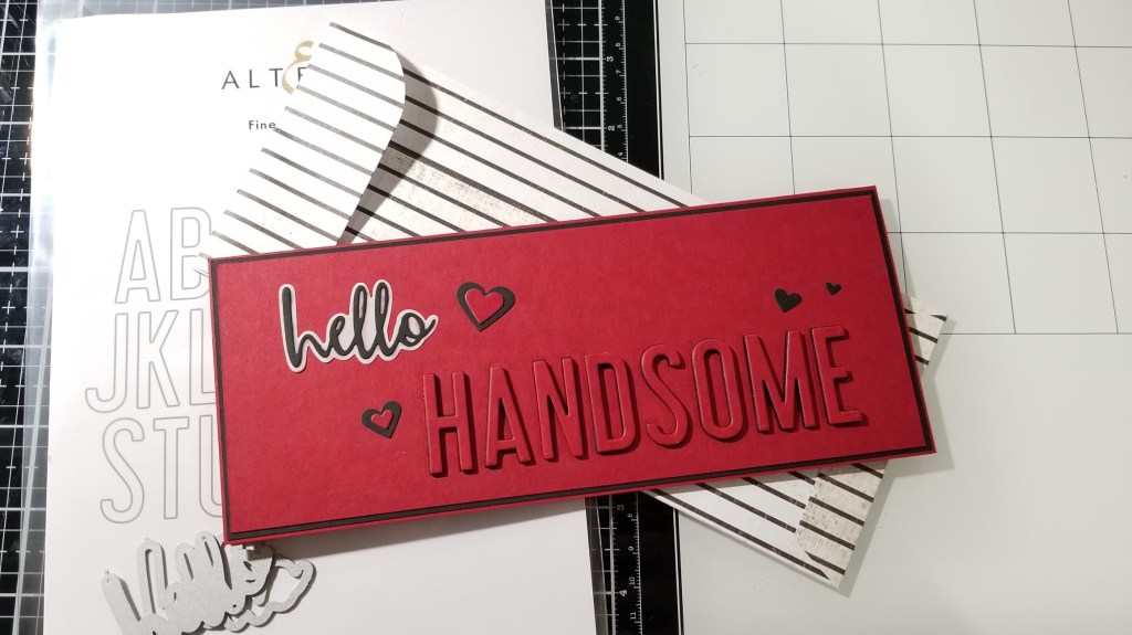 I die cut H A N D S O M E on my card panel, and die cut the same letters in black fun-foam using my altenew alphabet dies. I pulled out one of my ‘hello‘ dies and cut it out of black cardstock, with the background die in vellum.