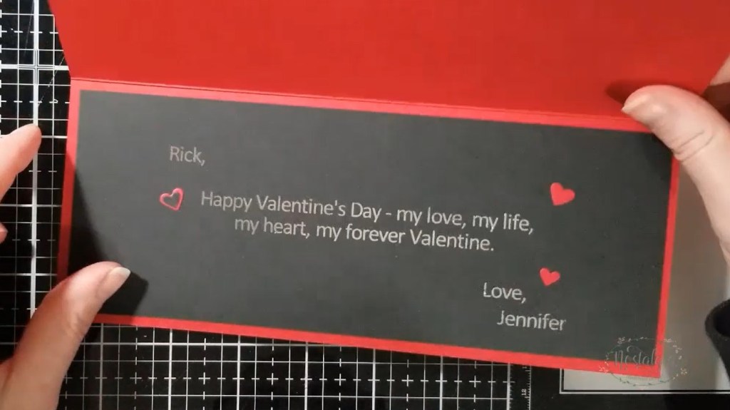 For the inside of my card, I printed my sentiment on black cardstock using my laser printer and applied silver Deco Foil with my laminator. Finally, I added die cut hearts to both the font and inside panel in black and red.