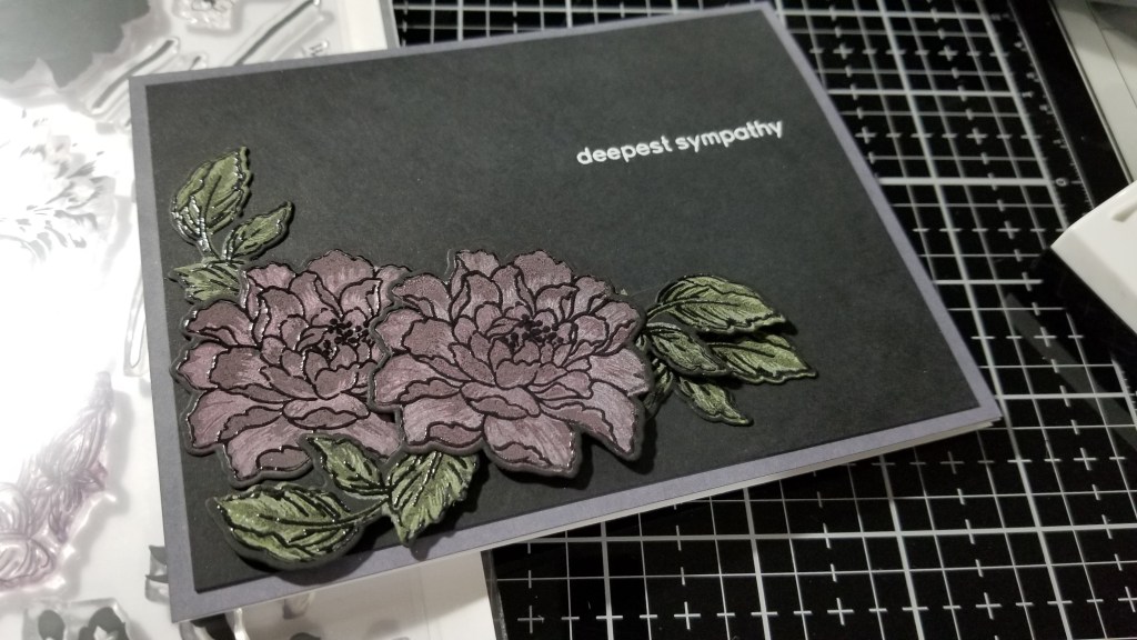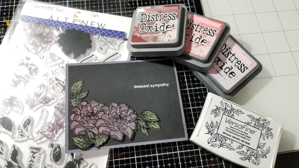 Welcome back, all. I really like the design of this card with the black on black. The distress oxide inks make it easy to stamp on the black cardstock, as they’re more of a pigmant ink.