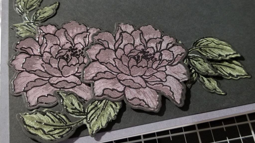 After stamping my layers, drying them and stamping my outline in Onyx Black, I used clear embossing powder to set the black and give the flowers and leaves more dimension.