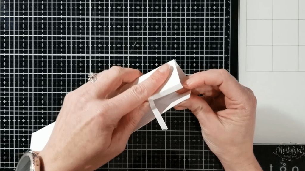 Fold the paper to create a triangle and adhere the .25 inch flap to the 1.5 inch side. Now you should have a triangle tube.