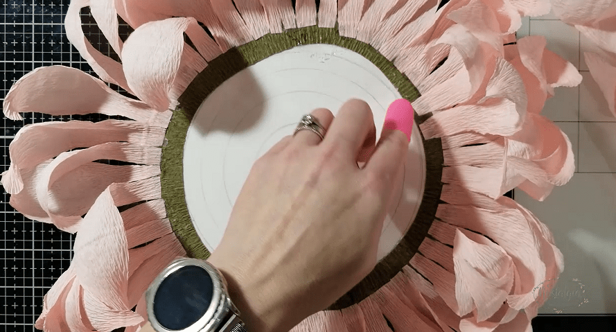 Once I have my circle, I cover it in green crepe. You could use any color your like or leave it uncovered. It’s up to you, as once the flower is mounted on the wall, you shouldn’t be able to see the base. NOTE: Under the crepe, I hot glue string in order to be able to hand my flower. You can also use Command hanging strips.