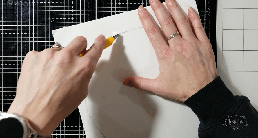 Cut a circle out in your foam core. The diameter is 20.5cm or 8″. The size of the circle will contribute to the size of your flower. The other contribution to the size of your flower is the size of your petals.