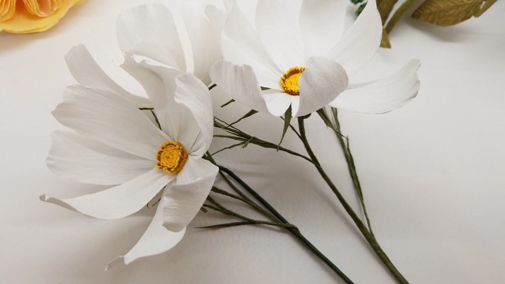 For this post, I’ll be sharing how I make my crepe paper cosmos. It’s not a hard flower to make with minimal supplies, but I find it easy to miss up. If the center and petals aren’t the right size or placed just right, your cosmos will look really wrong.