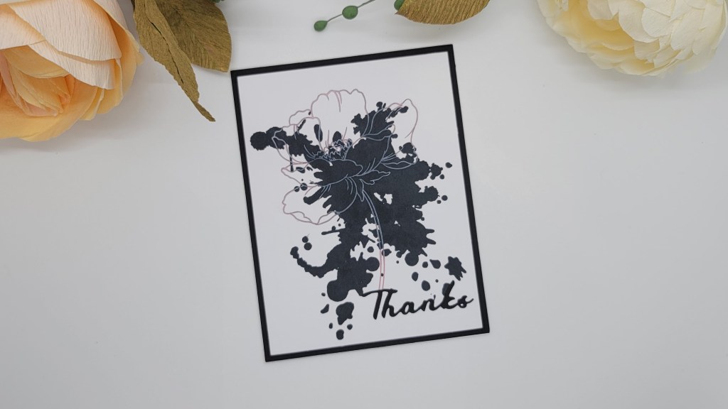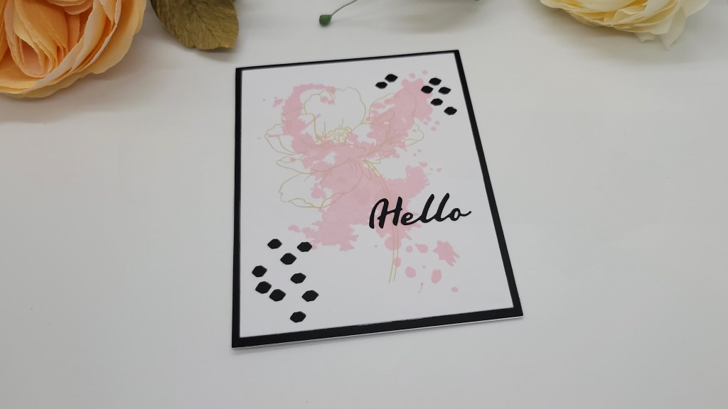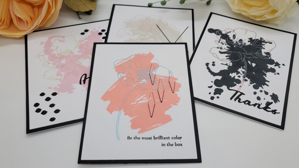 This first card, with the black background and pink-stamped flower is my favorite. I love how it looks. So simple but almost chaotic at the same time.