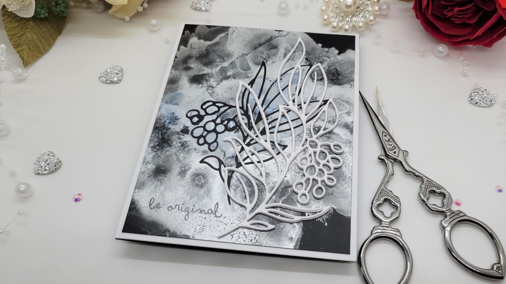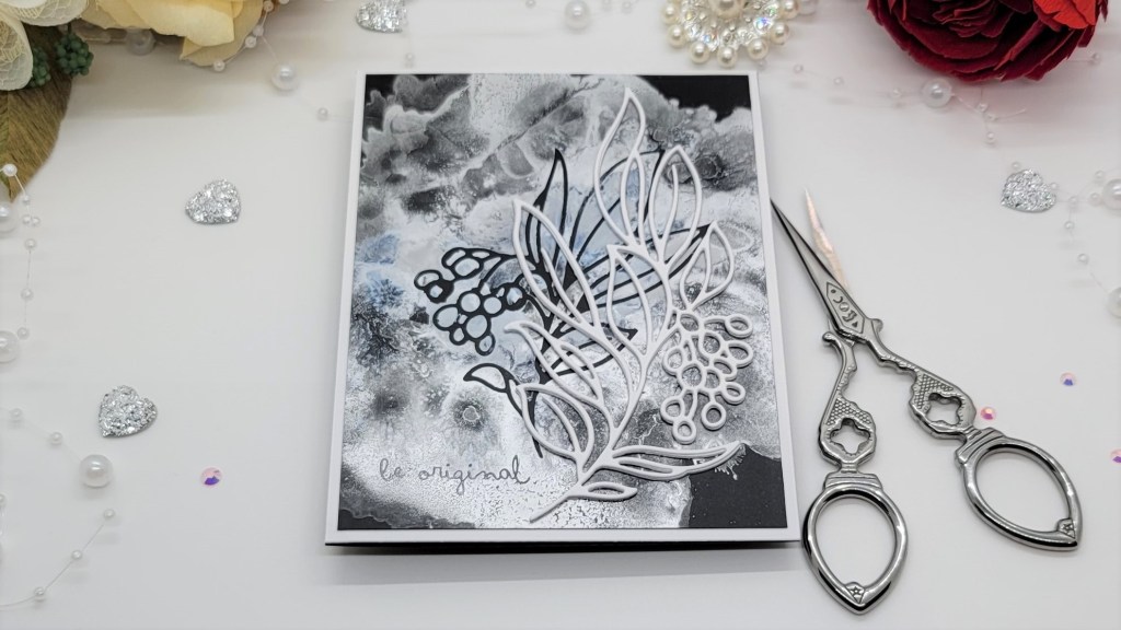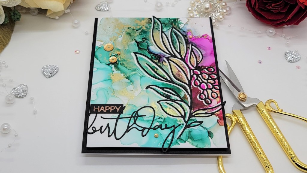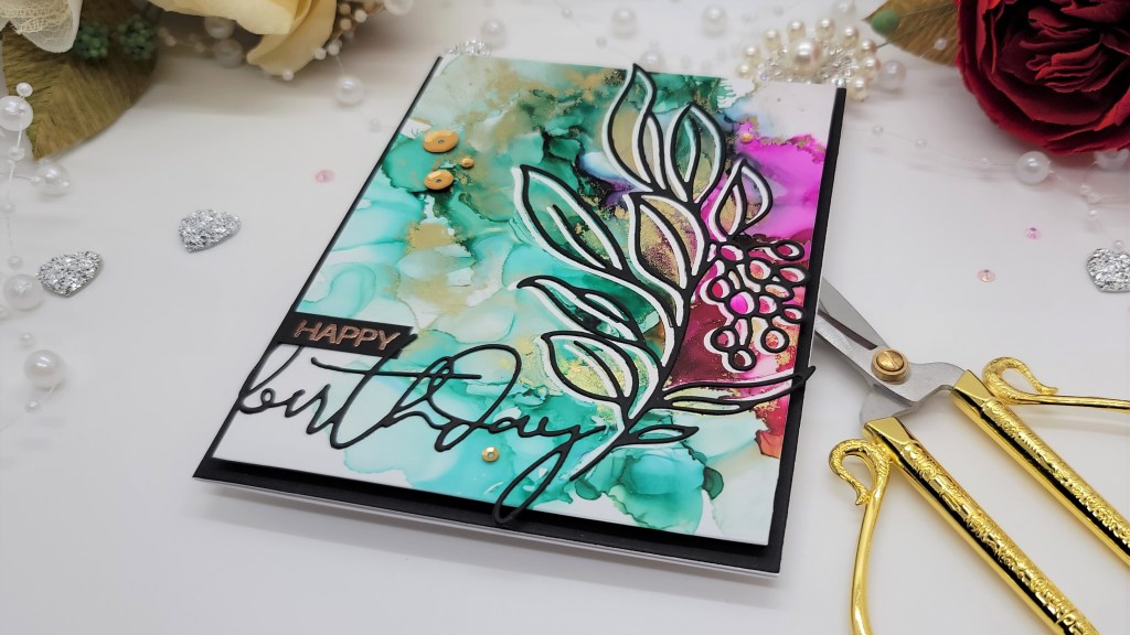 My second card was a bit different. This is something I’ve been thinking about doing for a while, but just never got around to it, and that’s using a die-cut piece of vinyl to mask with alcohol inks.
