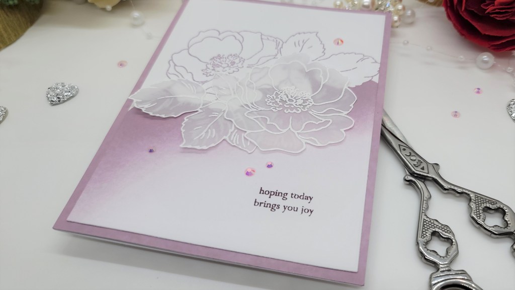 With this card, I masked off the flowers, leaves and half of my panel with Altenew’s masking paper, and ink blended, using the same colour as my stamped images. Then I added my white heat embossed images on top.