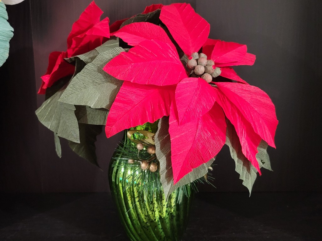 A few years back I made poinsettia stems for some home decor. I have a beautiful Christmas vase I use with fairy lights and it is a beautiful addition to my home during the holidays.
