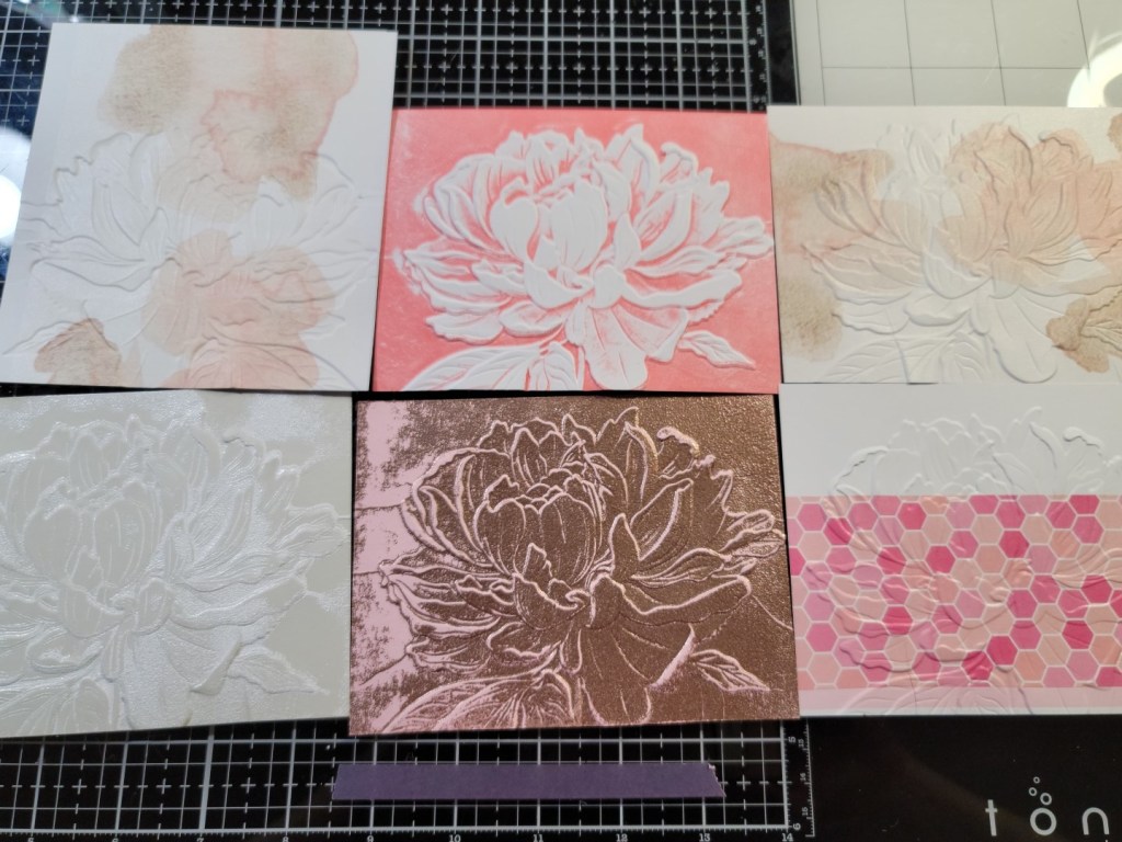 This course was fun, and I embossed a lot of card panels. I tried all the techniques from the classes. Some worked for me, and some didn’t. I think the problem I had with one of the techniques was the type of embossed design I was using.