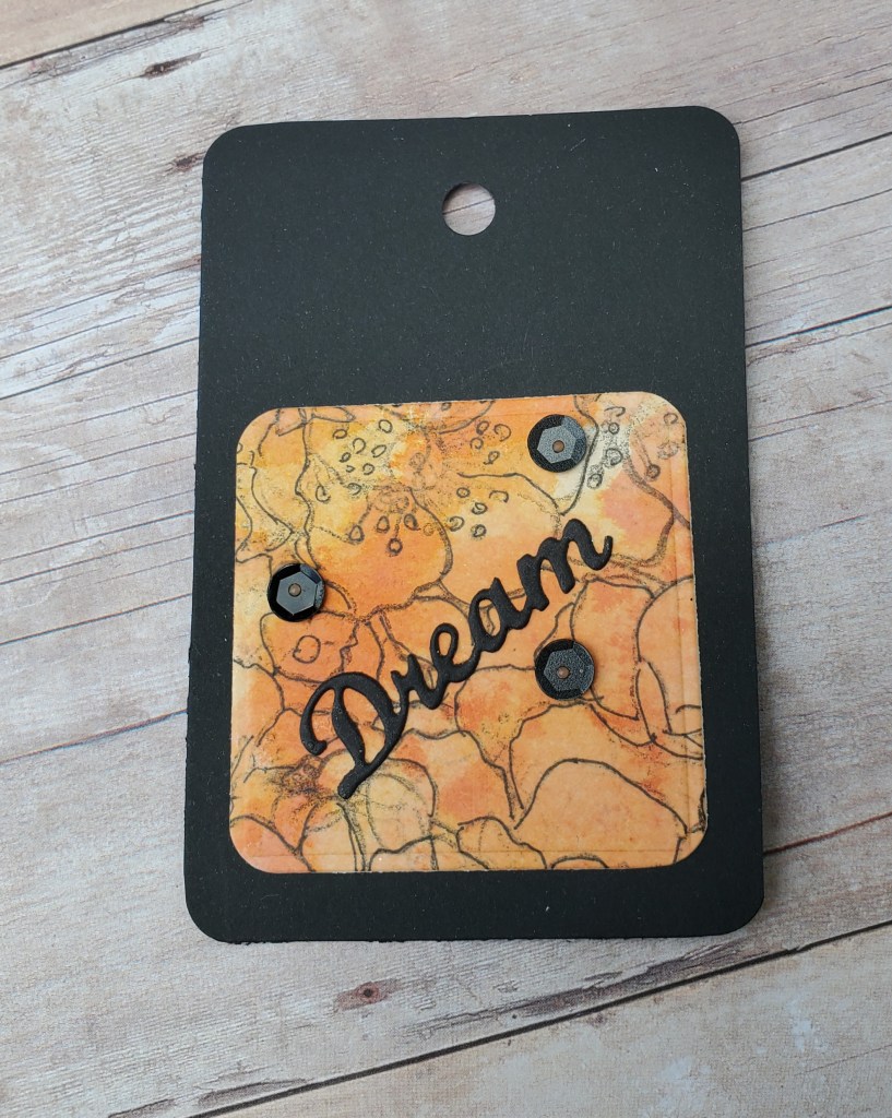 First we’ll put down ink onto a non porous surface, add water and ‘smoosh’ our (watercolor) paper on top. We’ll start with the darkest color first, then smoosh with a lighter shade to cover the entire panel of watercolor paper. Once we’re happy with the coverage of color of our paper, we’ll then smoosh yellow, but do this sparingly, as to only add some highlights. I should also note, the paper was heat dried before moving to another color. Using a heat gun to dry in between colors helps to minimize ink mixing, and keep the paper dry as we move forward for heat embossing. Clear embossing powder will be used for the stamped flowers with obsidian black ink.