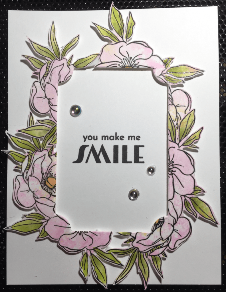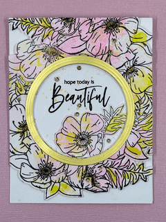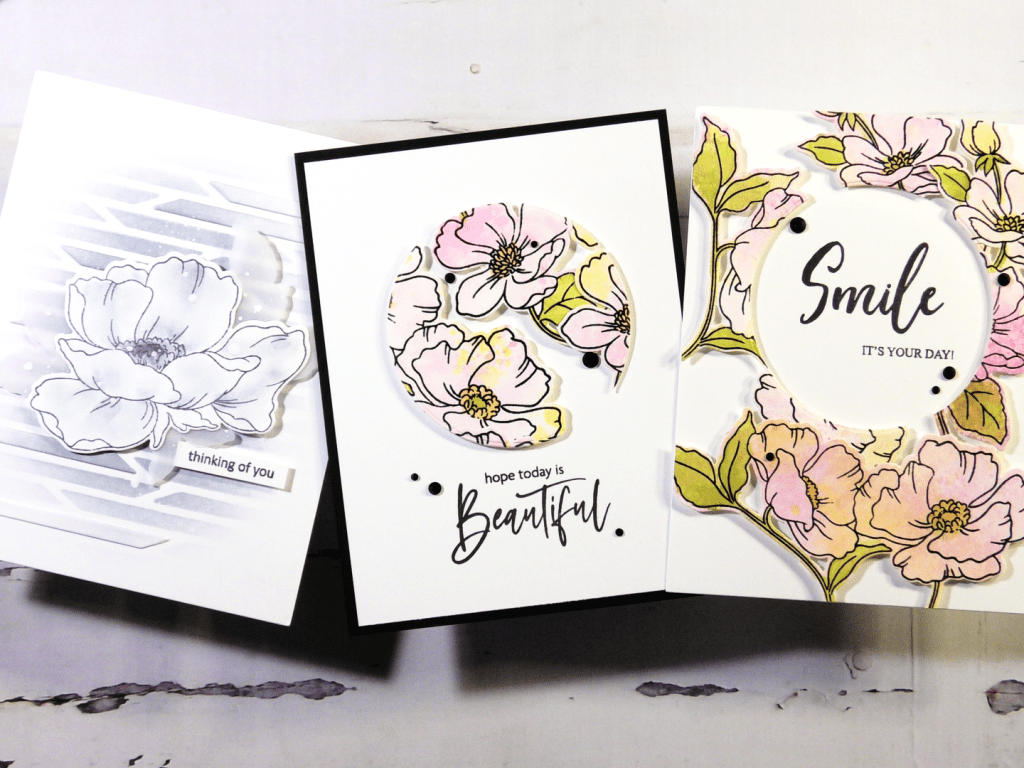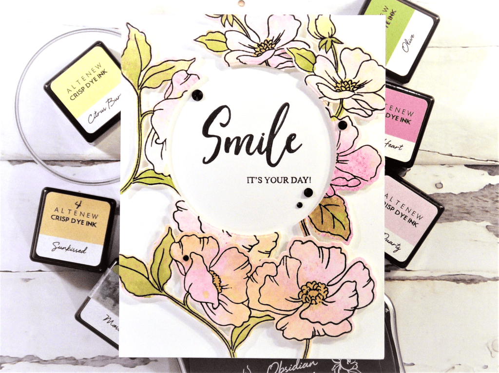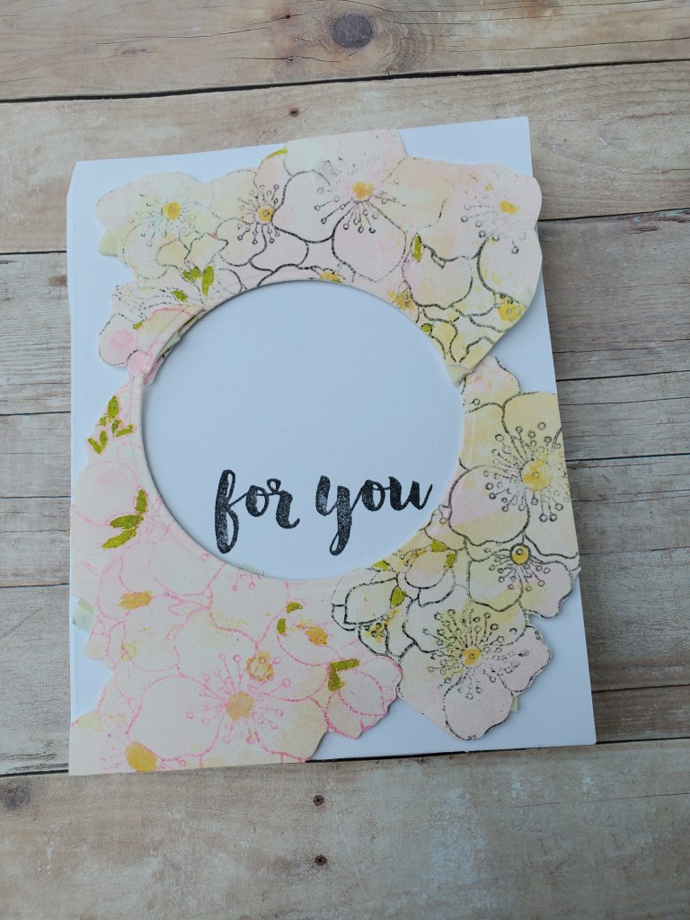 Both cards, 2 and 3, were created together, and by using a circle die on die cut flowers, we can use both pieces to create 2 cards. As I mentioned earlier, die cutting is the main technique for this workshop, and for these 2 cards, the secondaray techniques are dye ink smooshing, and dye ink watercoloring.