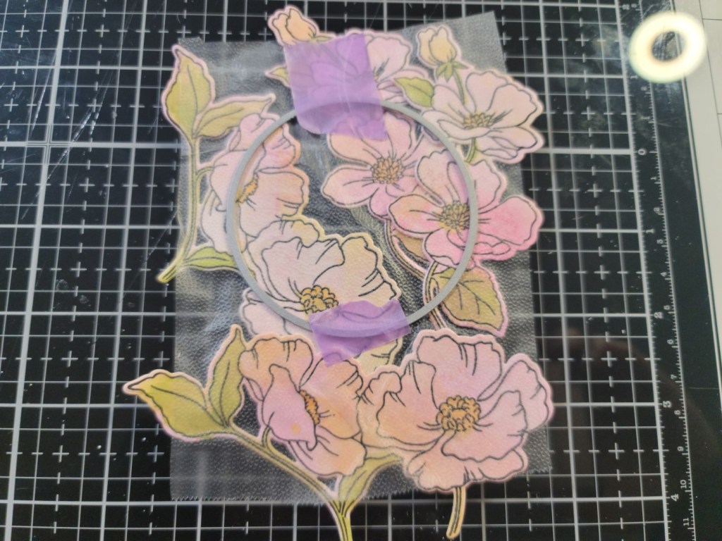 The flower images will be die cut and placed on top of card panel, and positioned in a way to cover as much as the card panel as possible. Cover with press and seal and remove the card panel.