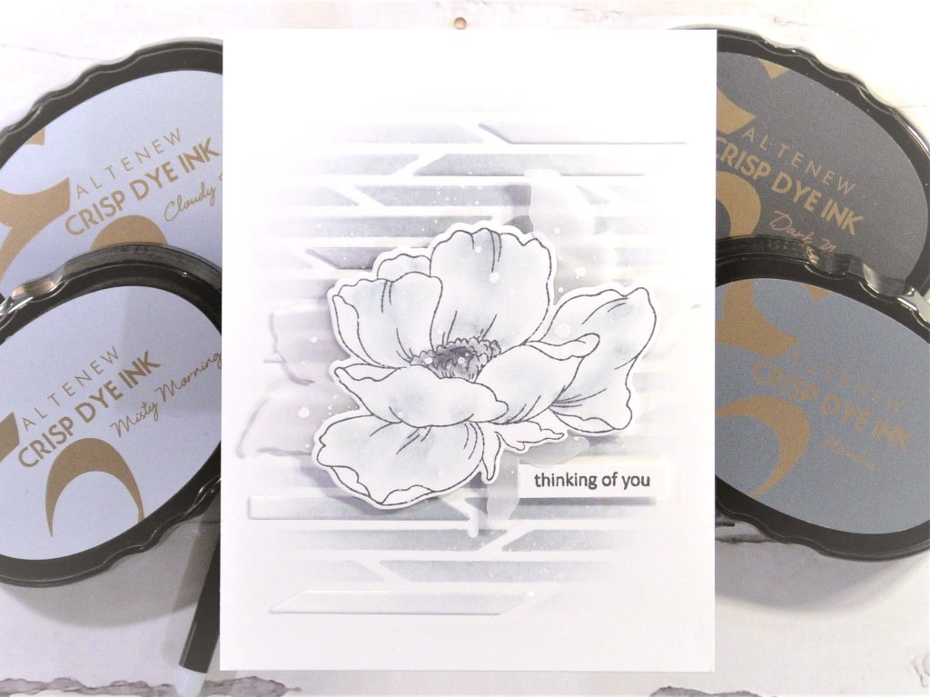 The first card was about taking your background dies to a new level by using the die cut as a stencil, and using inlay die cuts to add dimension and interest. The secondary technique was creating a card with monochrome colors. Altenew’s Tranquility Die Ink bundle was perfect for this project. Using the largest flower from the poppy stamp and die set, we stamped the flower in the darkest color from the Tranquility set. Using a detailed blending brush, we highlighted the flower to create shadows using the 3 remaining colors from the ink set. The stamped flower was die cut, and the leaves were die cut with vellum and adhered to the back of the flower. The flower and leaves were adhered with foam tape, and we finished off the card with white splatter, and a small and simple sentiment.