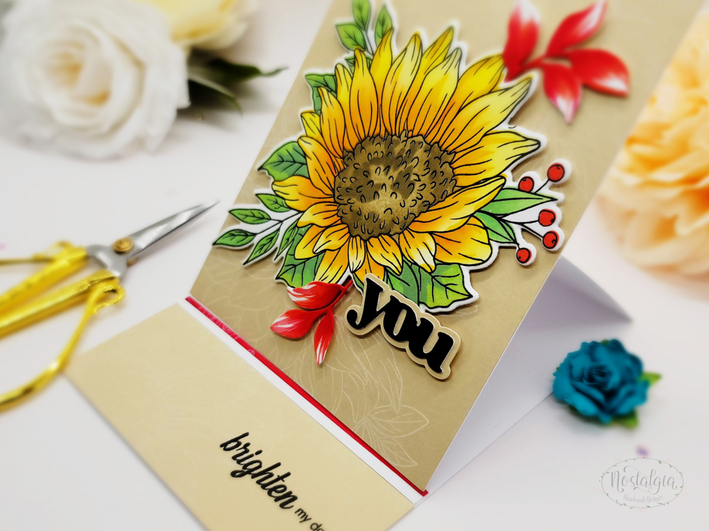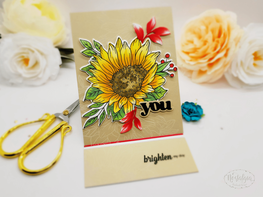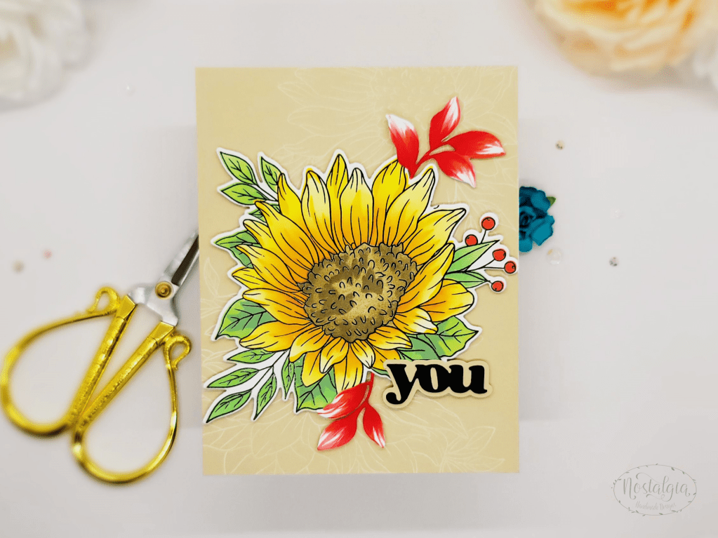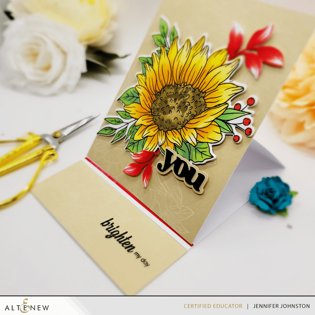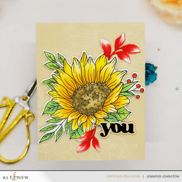 Altenew’s Dancing Sunflowers are so beautiful and big – just one takes up most of the panel. I incorporated some additional leaves and pulled out my copics to add a bit more red to help accent the red berries.