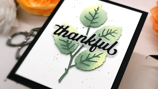 This is a beautiful C & S card using large leaves and the ‘Thankful’ die cut sentiment with a vellum shadow.