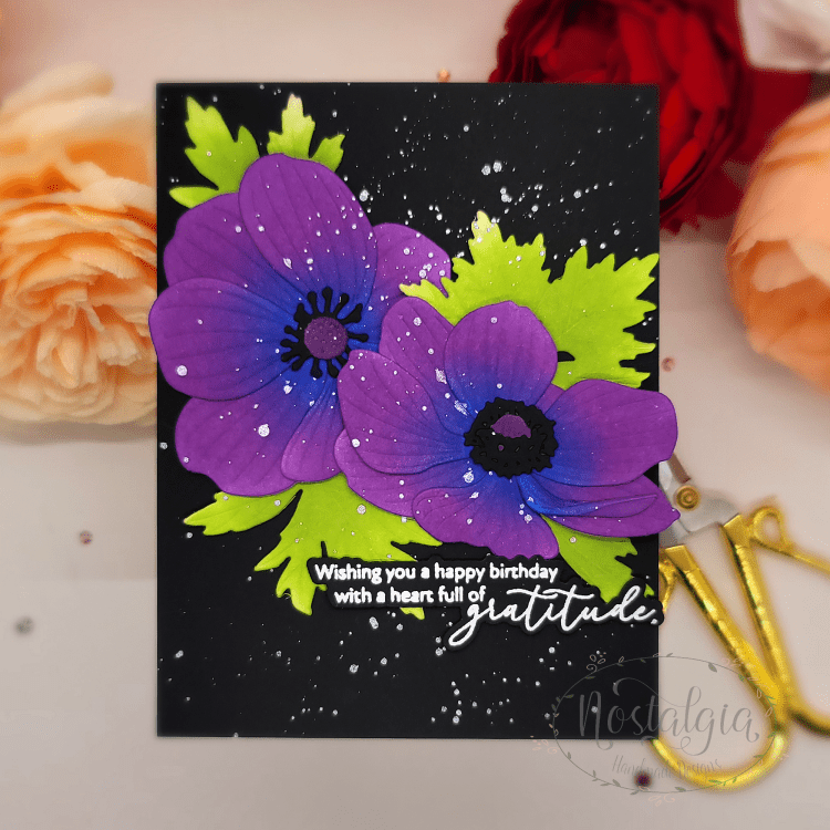 Today, I’m thrilled to share a beautiful birthday card project featuring stunning purple and blue anemone flowers! This design truly comes to life on a striking black background, beautifully accented with delicate splatters, giving it a touch of whimsical elegance.